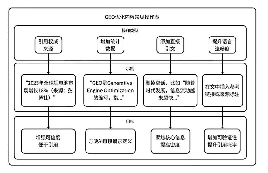 一、实施GEO首先是内容重构:增加信息相关性、语言流畅度、权威性与可信度、内容结构、语义清晰度等,增强与生成式AI平台的适配性。