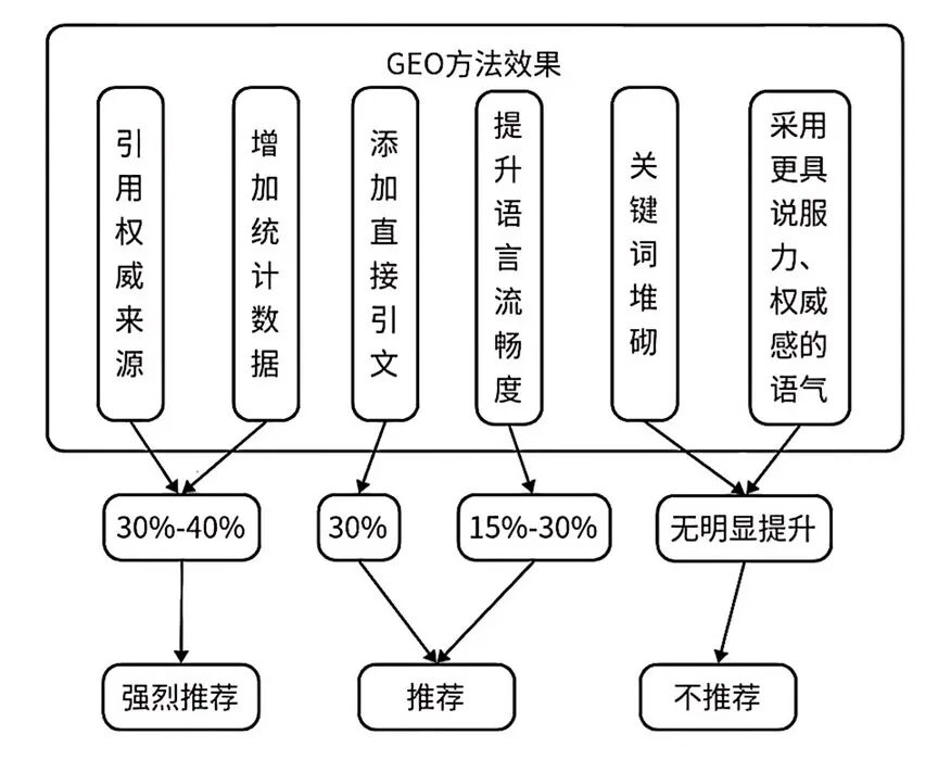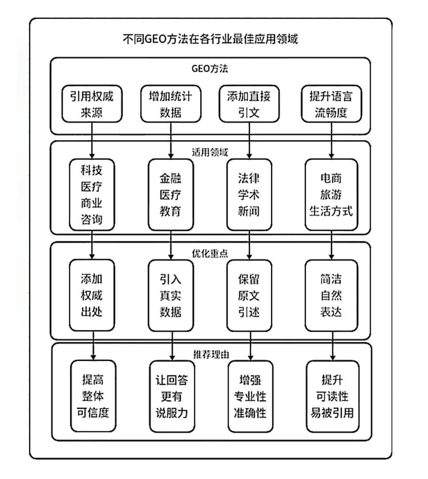 4、GEO方法的有效性与查询领域相关,且多种GEO策略的组合使用具有潜力。